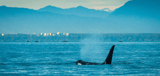 Orcas: Three ecotypes of orca can be observed off the coast of BC. Offshore killer whales do not enter coastal areas frequently and are unlikely to be seen. Thriving and growing populations of whales, such as Bigg’s orcas and humpbacks, are more visible and more likely to be encountered, starting in April. Sightings of large numbers of these orca peak in the spring then can drop of in frequency early summer, before a second peak late summer and into fall.